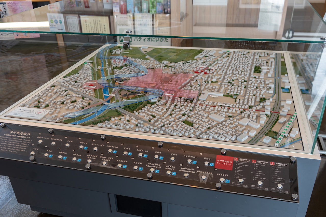 「今町歴史散歩コース」のスタート地点「道の駅パティオにいがた」では、今町地区を再現したジオラマによる案内も実施。俯瞰的にまちの姿を知ることができます。