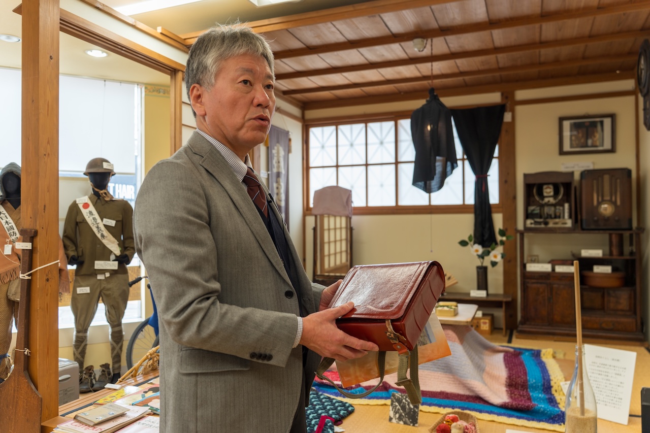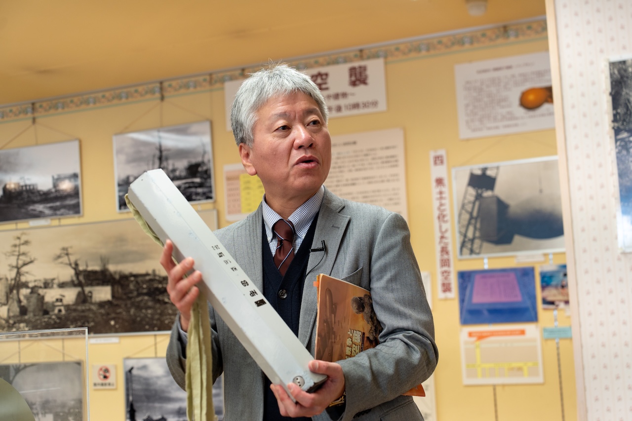 「戦争について知ることは、平和の大切さを学ぶことにつながる」と話すのは、館長の近藤信行さん。「展示を見るだけでなく、実際に触れてみることで、より深い理解につながると考えています」と近藤さん。例えば、焼夷弾の模型を実際に持ち、その重さを体感することで、戦争のリアルな一端を学ぶことができます。また、戦時中の暮らしを再現した部屋では、当時の住環境を体験し、戦争が日常生活に与えた影響を、見て、触れて学ぶことができるようになっています。