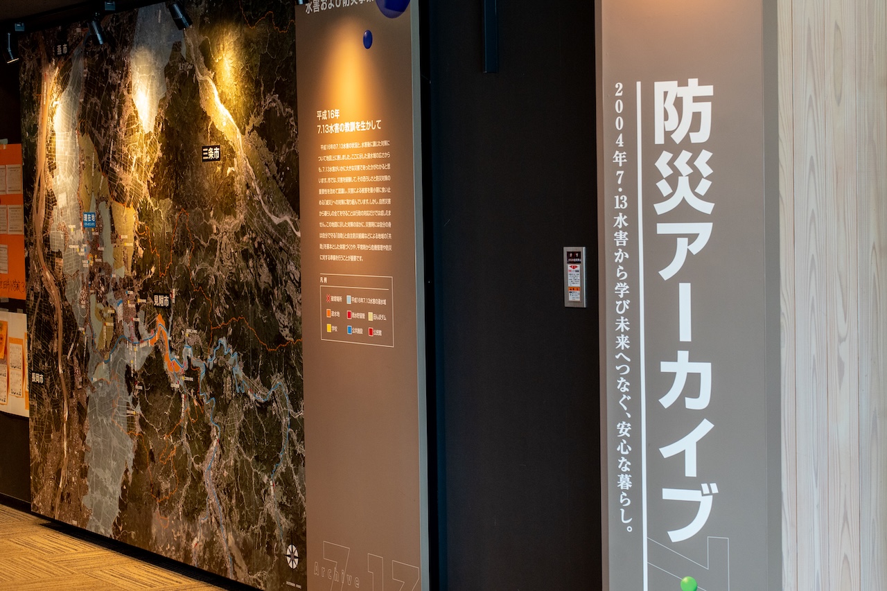 さらに、館内には7.13水害からの教訓を生かしたまちづくりを紹介する「防災アーカイブ」が設置されています。防災意識を高める拠点として、多くの学びを得られる施設でもあります。