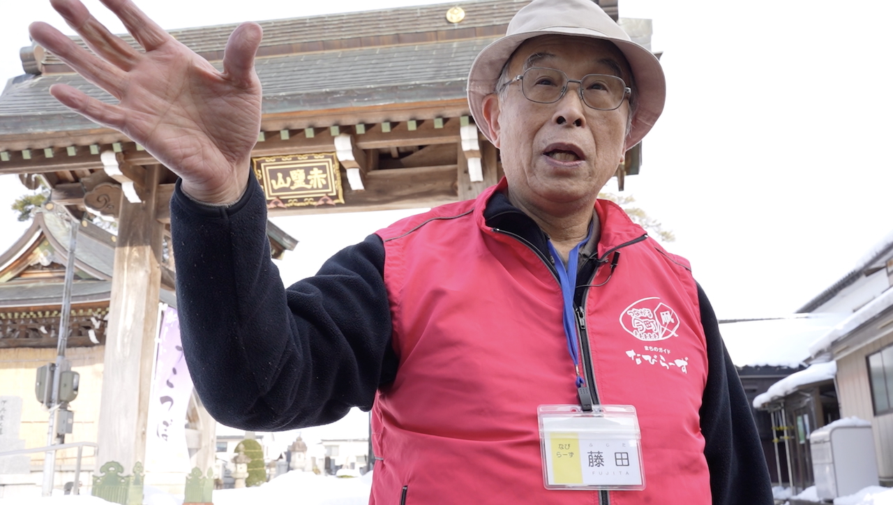 「まさに、あちらの方角から、いま私たちが立っているこの場所に向けて河井継之助の軍勢による攻撃が行われました。隠れている敵を炙り出すため、町には火が放たれ、ほぼ全域が焼失しました」。臨場感たっぷりに説明してくれたのは、『なびらーず』代表の藤田潤治さん。
