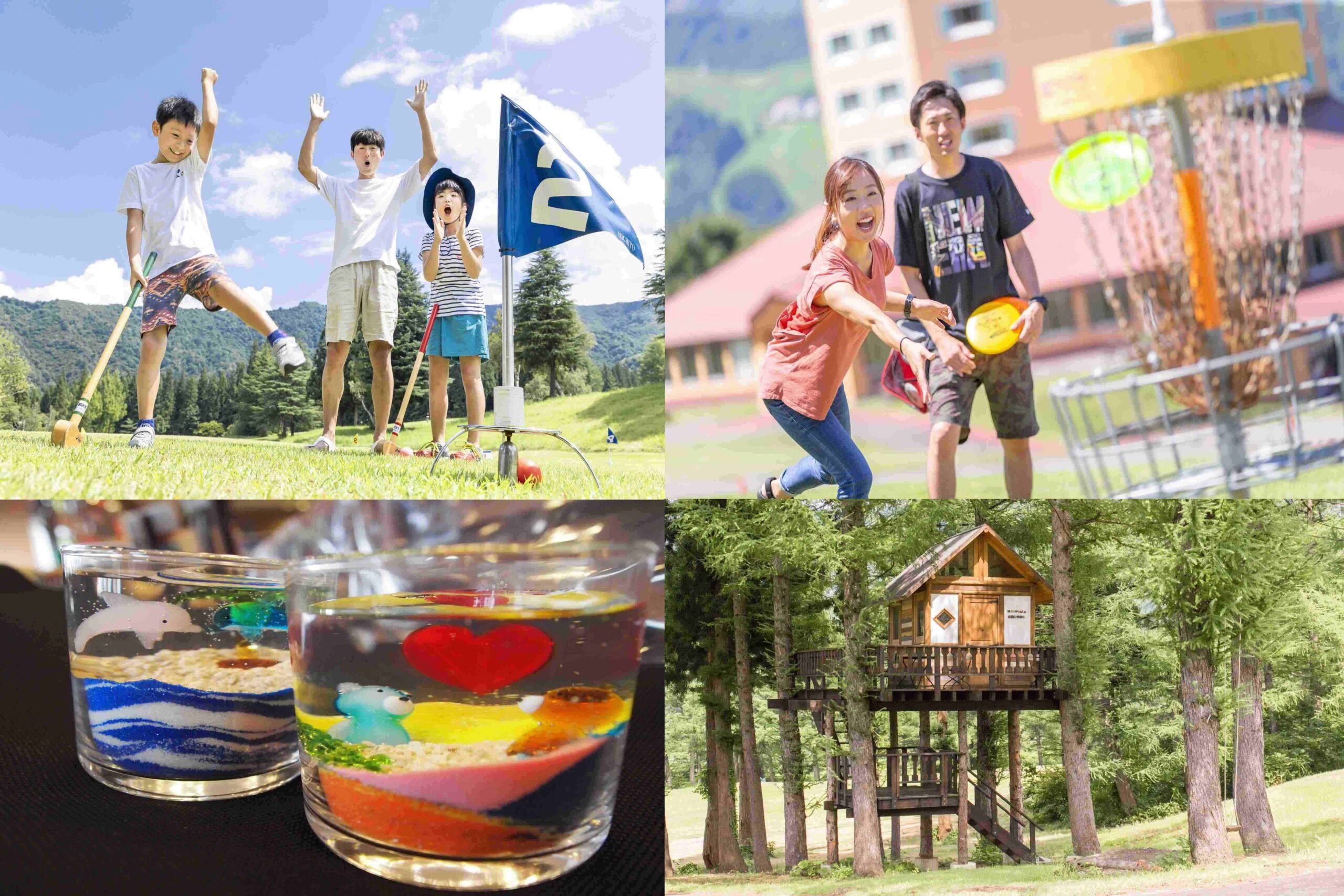 「ディスクゴルフ」「グラウンドゴルフ」「ツリーハウス散策」「飯士山ハイキング」「ぬか釜炊飯&おにぎり作り」「キャンプファイヤー」「焚火デザート作り」など -