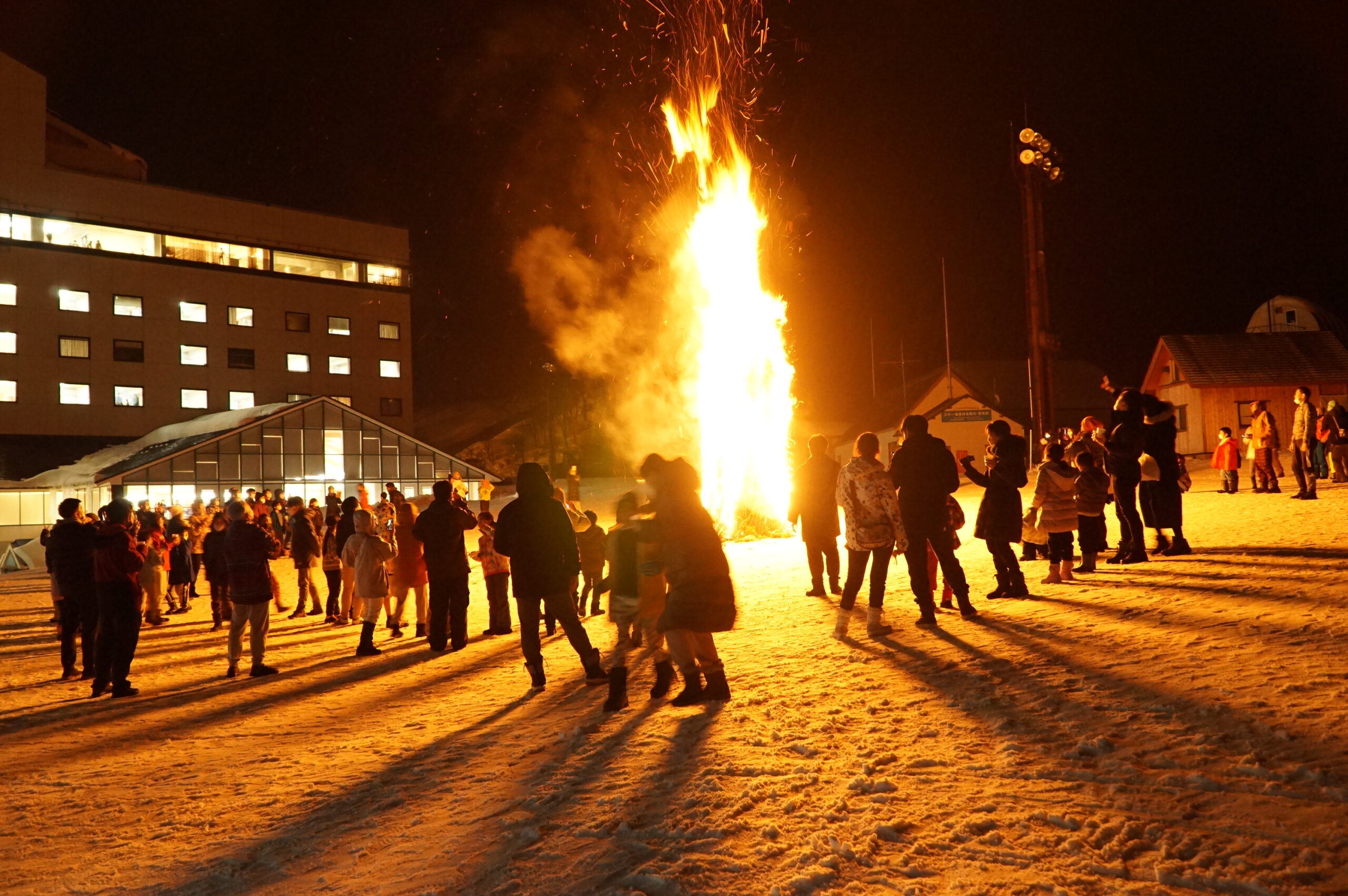 ゲレンデの雪原で 冬のキャンプファイヤー(どんど焼き)を囲んでのレクもおススメ