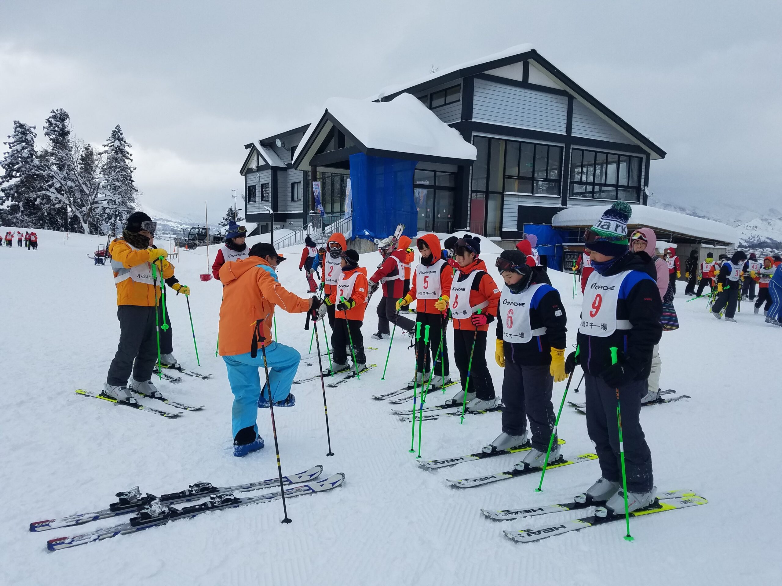 10人に一人のインストラクターをつけて初めてスキーをつける児童、生徒でも、一日でプルークボーゲンでスキーをコントロールできることを目指します。