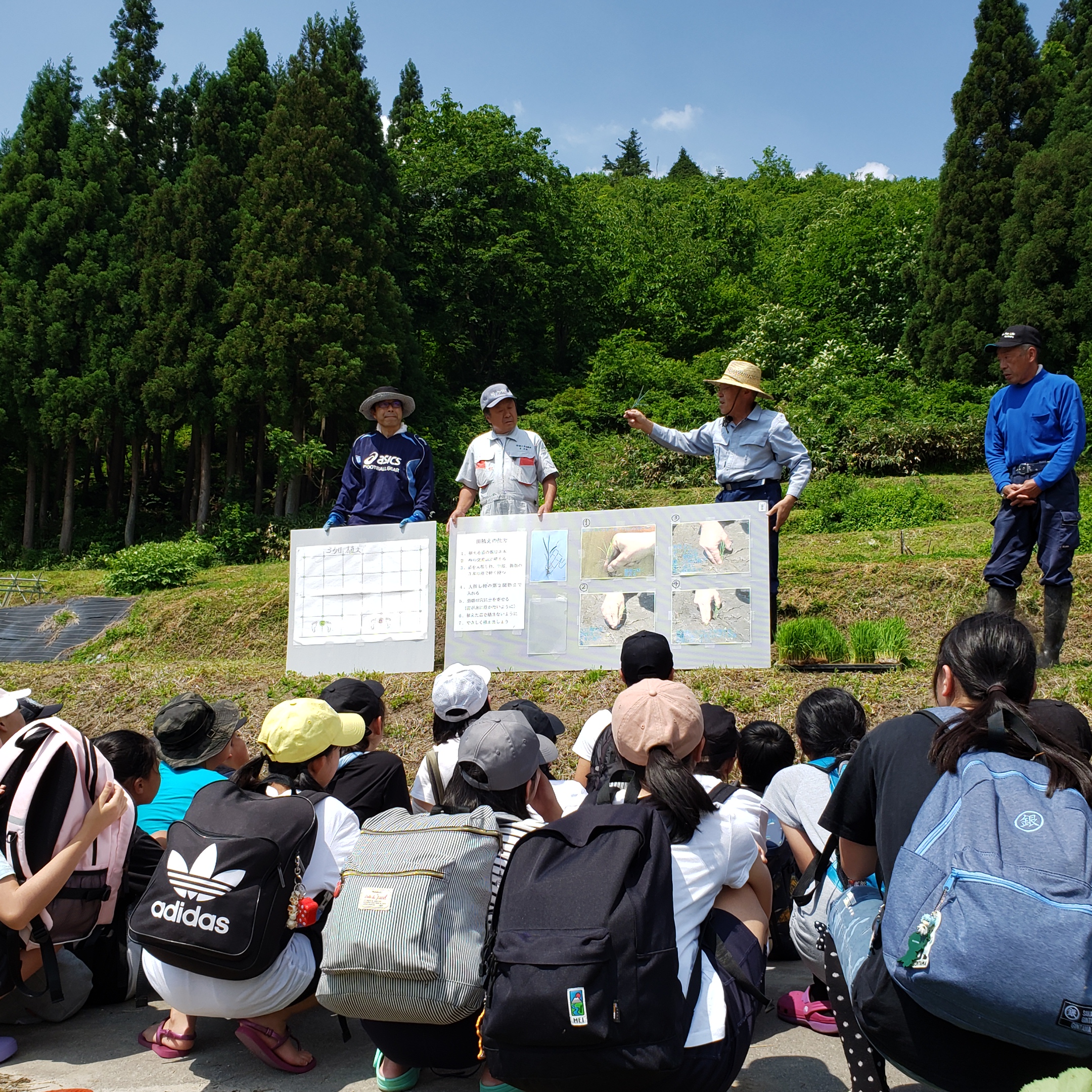 夏の田んぼの畔に立って、お米の生育の話を学ぶことも可能です。なんで田んぼが乾いているの?1株で何粒収穫できる?ごはん茶碗一杯は何株分?お米の花って?学ぶことはたくさんあります!