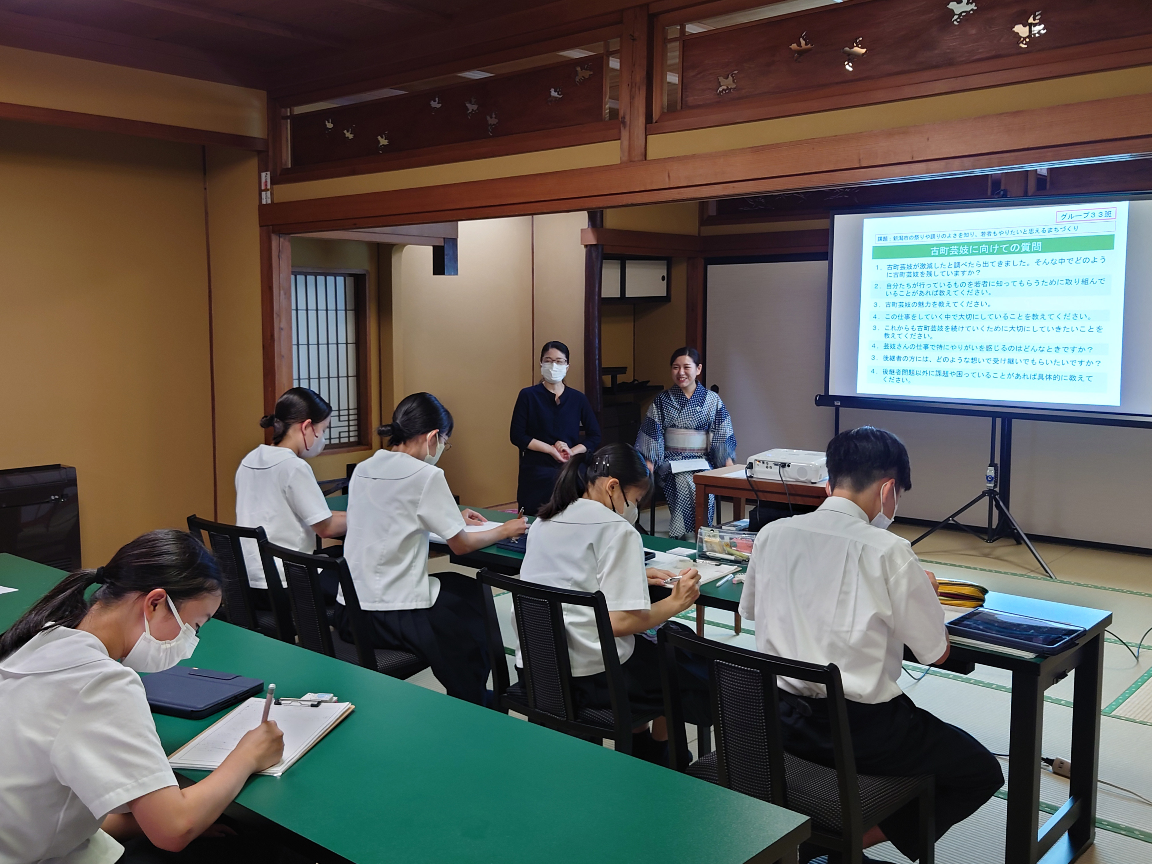 「古町花街」コースでは、現地学習で得られた学びをグループワークでシェアする機会を設けています。 自分たちの住む地域に残る伝統文化について調べたり、芸妓のように女性だけが就くことができる仕事を調べ「それが本当に女性でなければいけないのか?」をジェンダーの観点から議論するなど、現地学習で得られた学びを深めましょう。