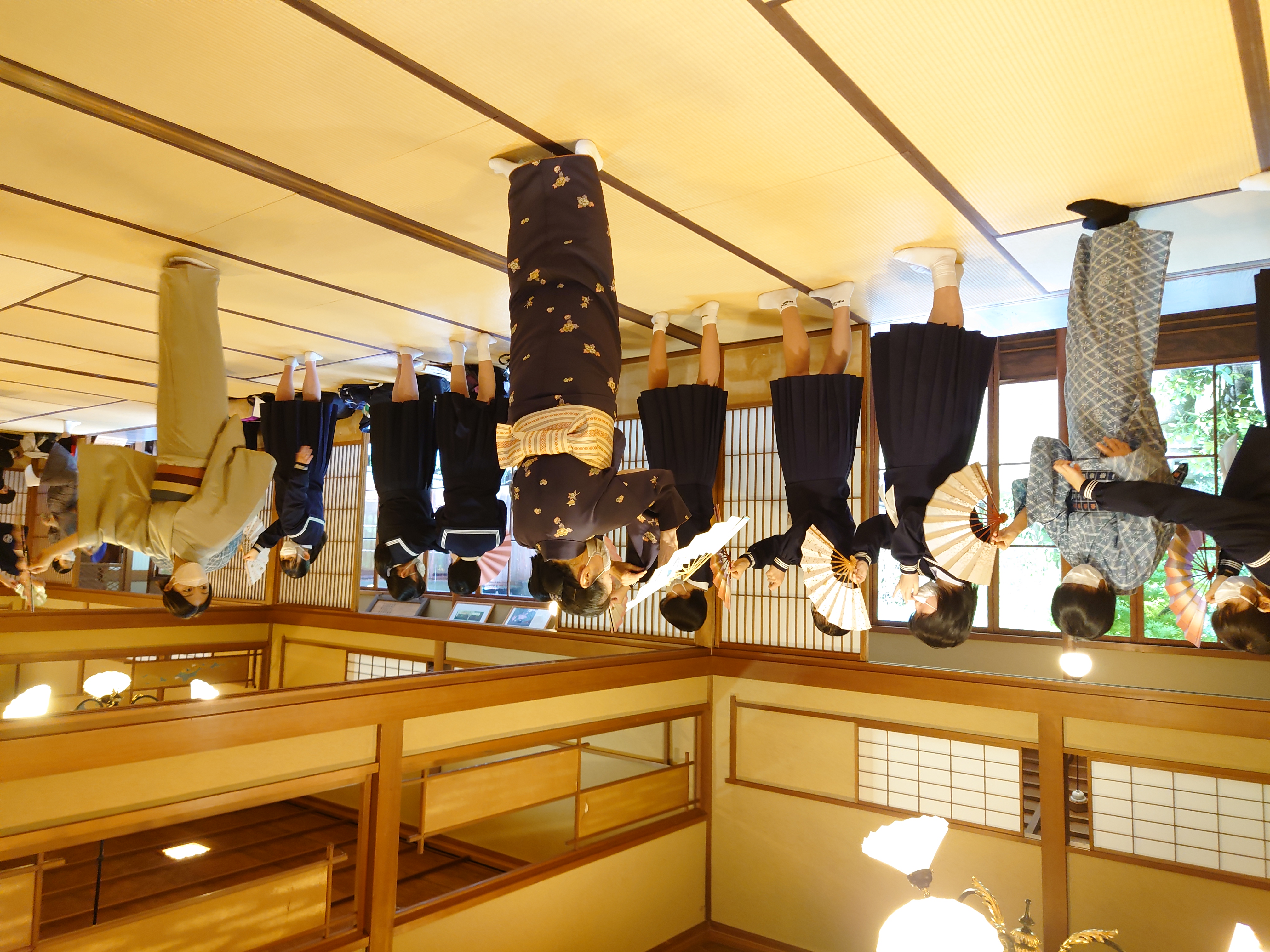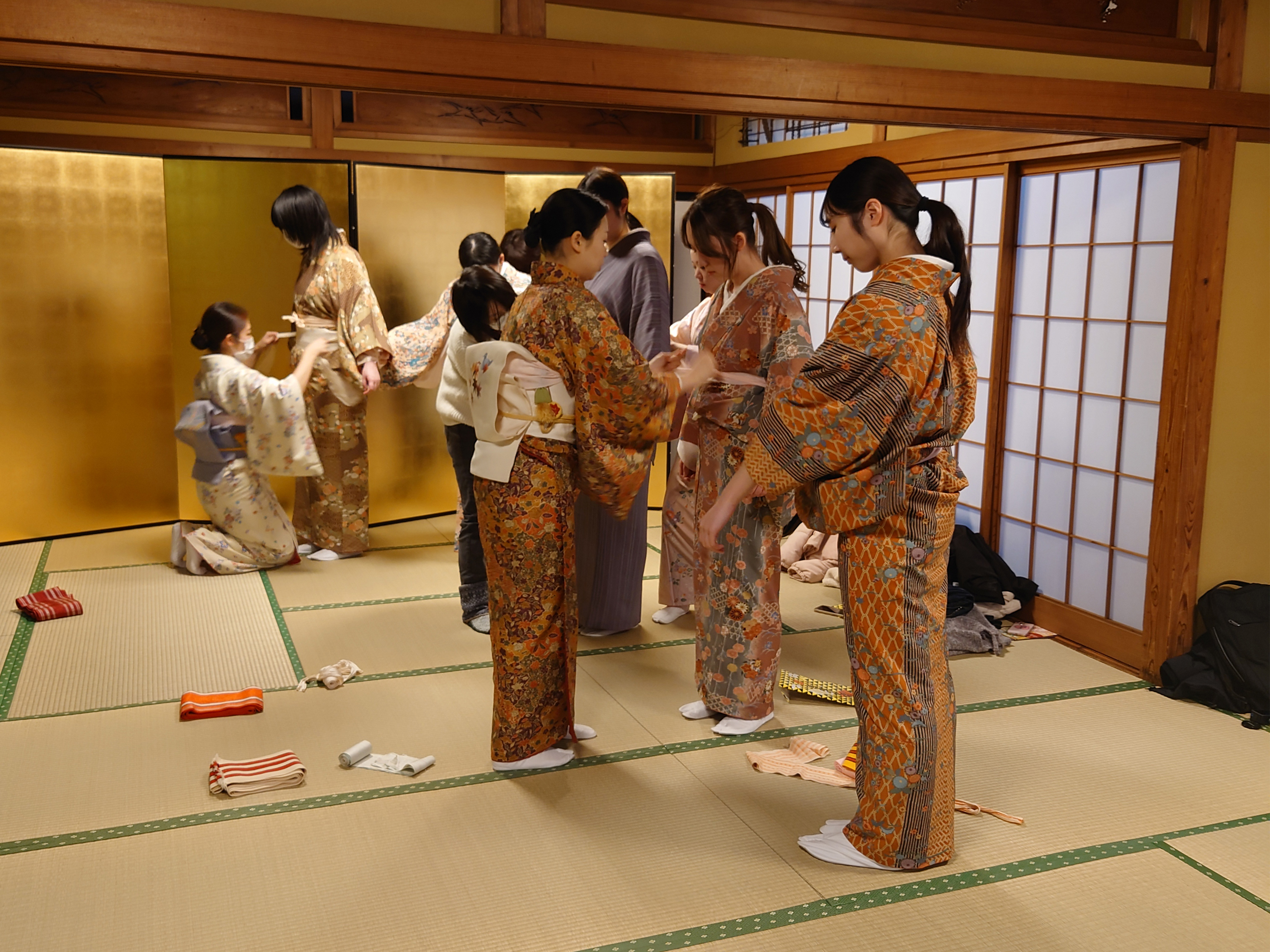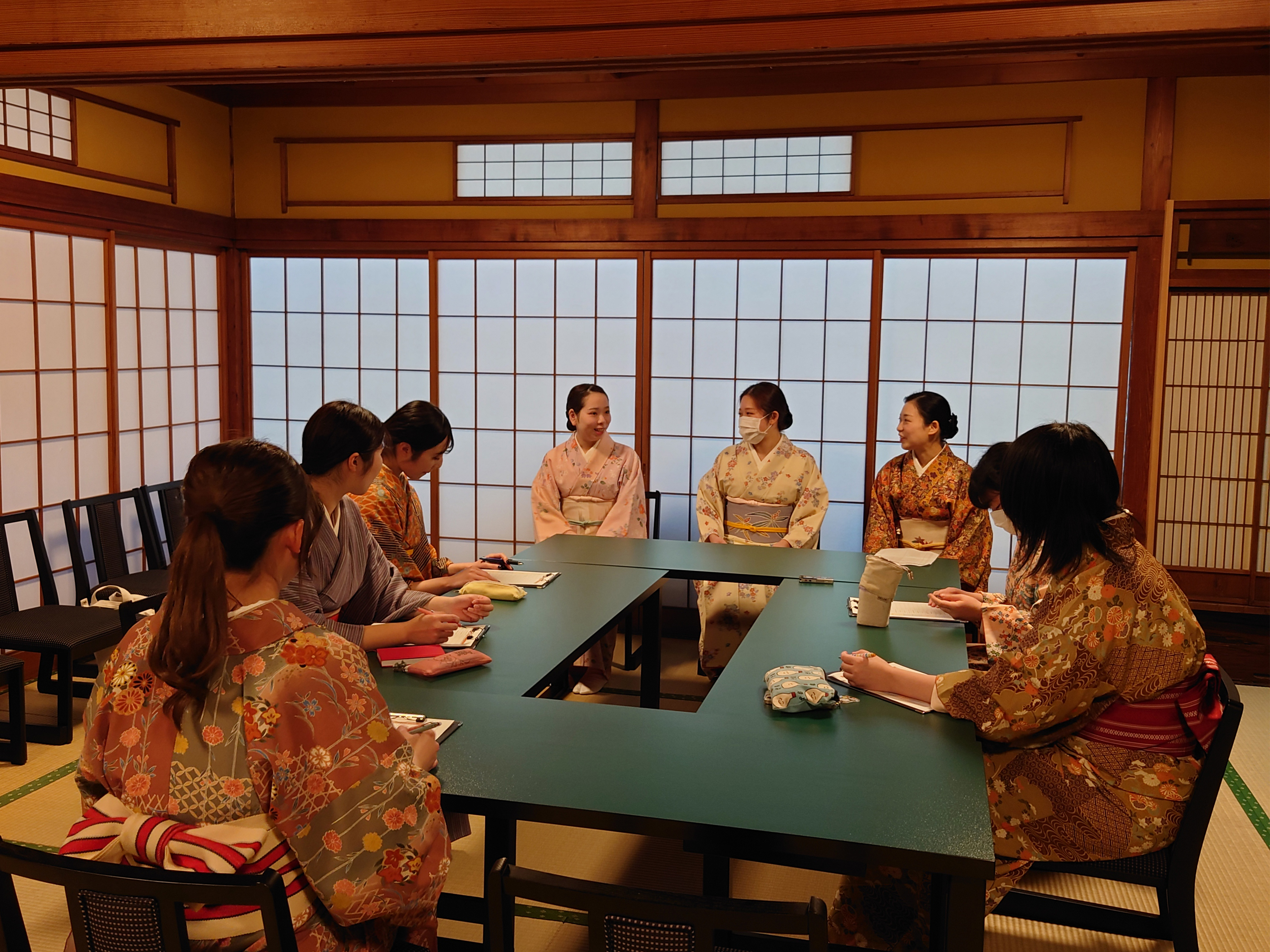 参加者からの質問に現役の古町芸妓が答えます。記念撮影も実施。和装での立ち姿の撮られ方についても学びます。着替えに際しては、着物のたたみ方をレクチャー。